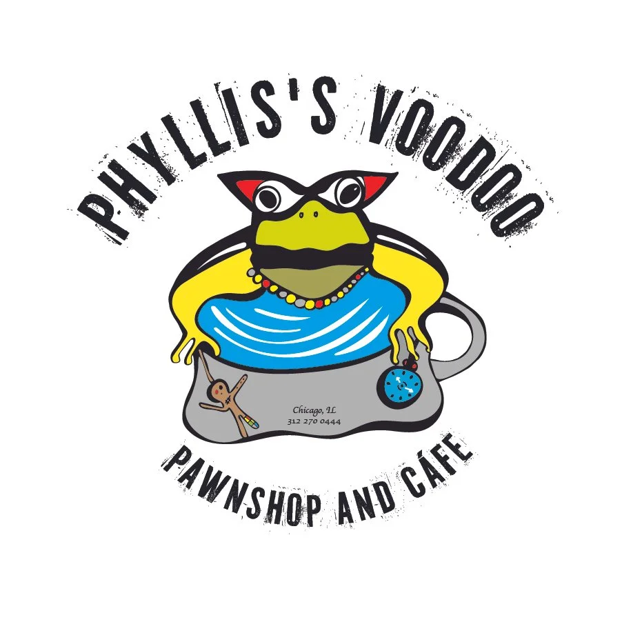 This logo was developed from a vivid and imaginative brief: Phyllis, a sexy voodoo bullfrog with a subtle, confident smile, seated inside a coffee mug that doubles as a portal to another dimension.
