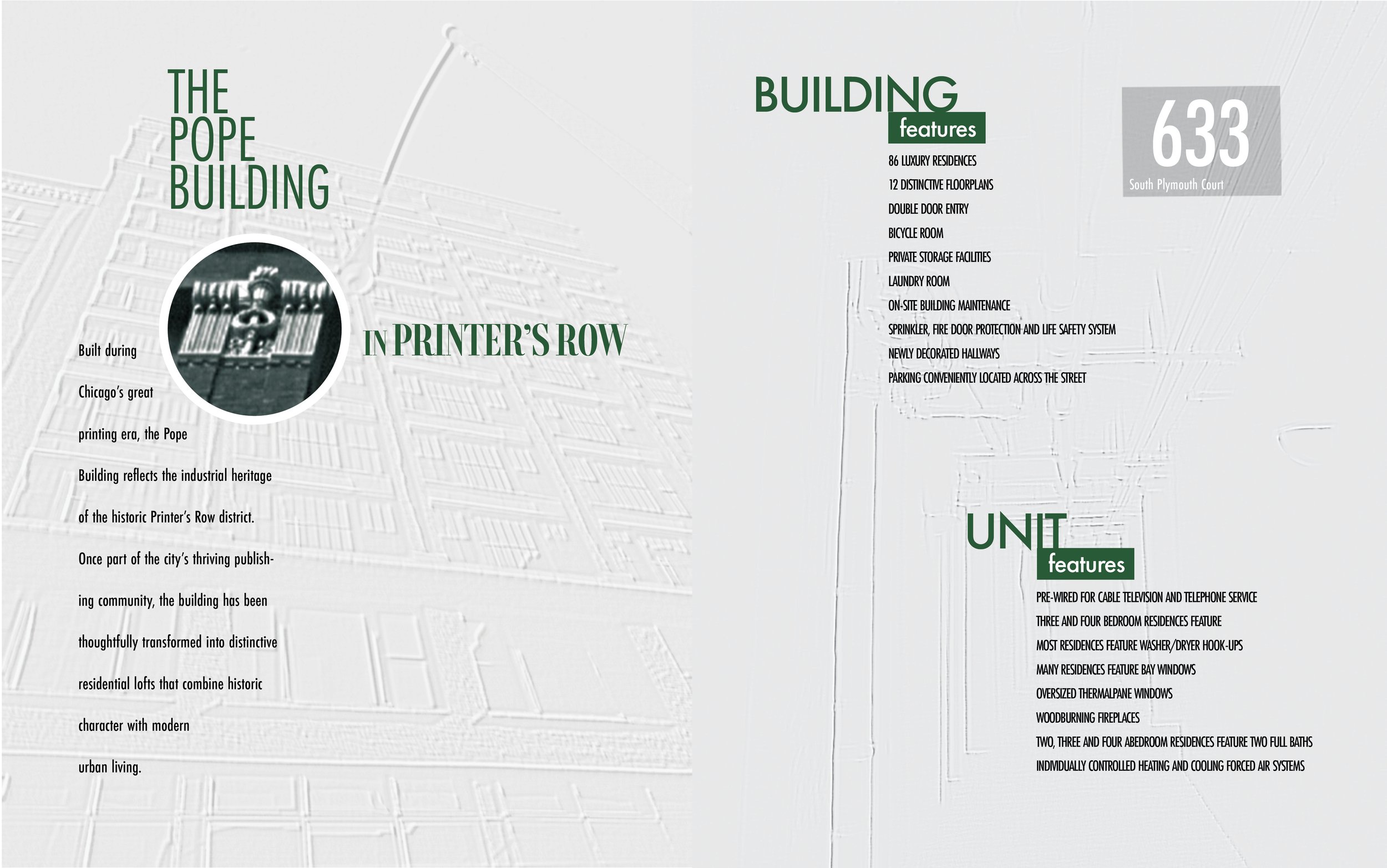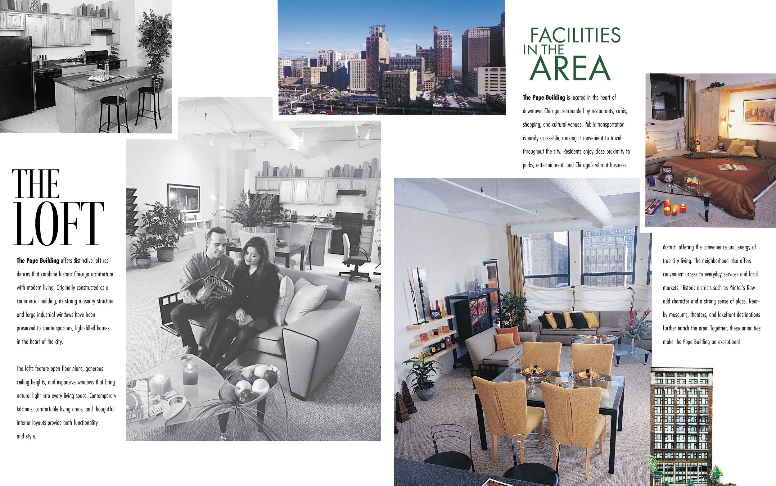 This brochure was designed for The Pope Building, a historic Chicago property transformed into modern residential lofts. The project brings together architectural heritage and contemporary urban living through a structured and visually engaging layout.