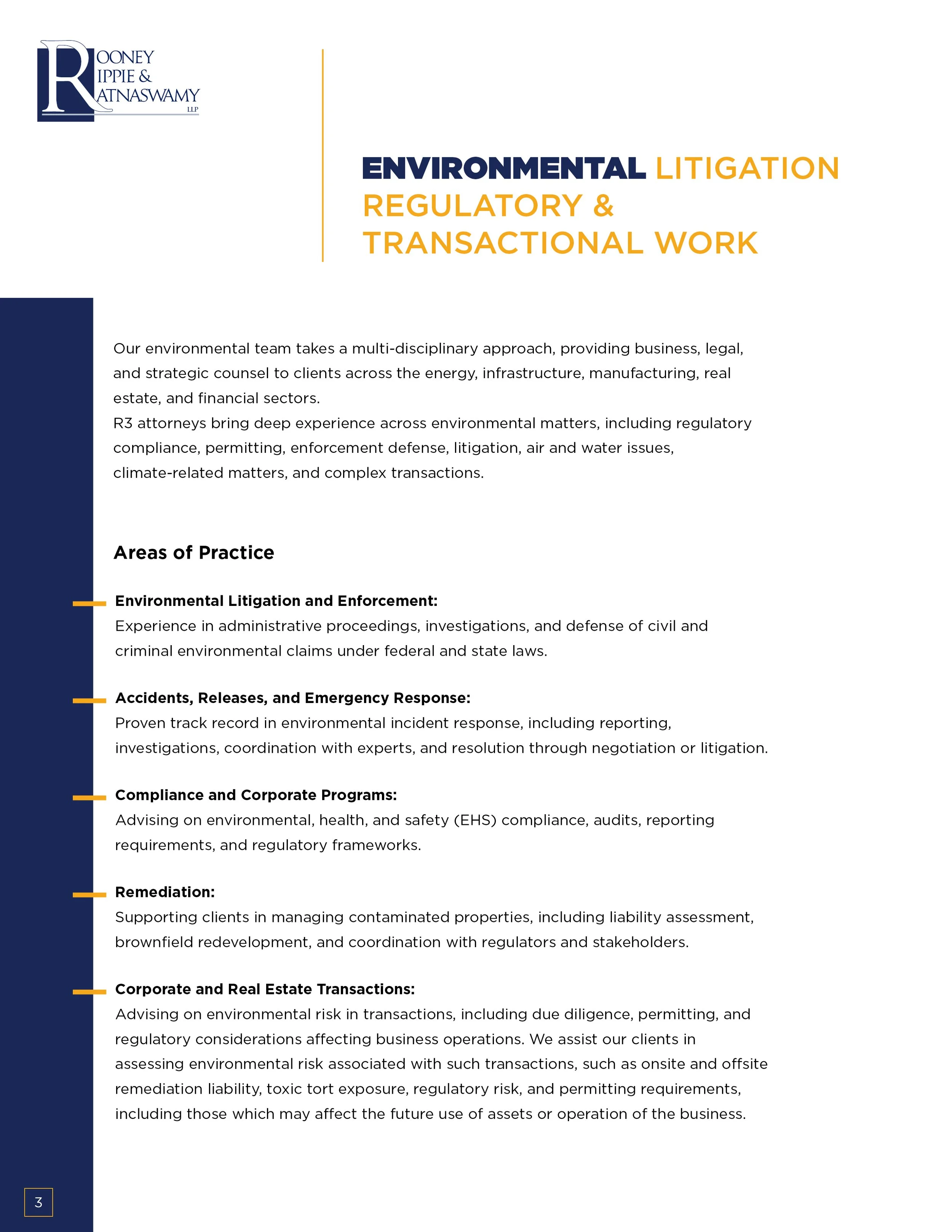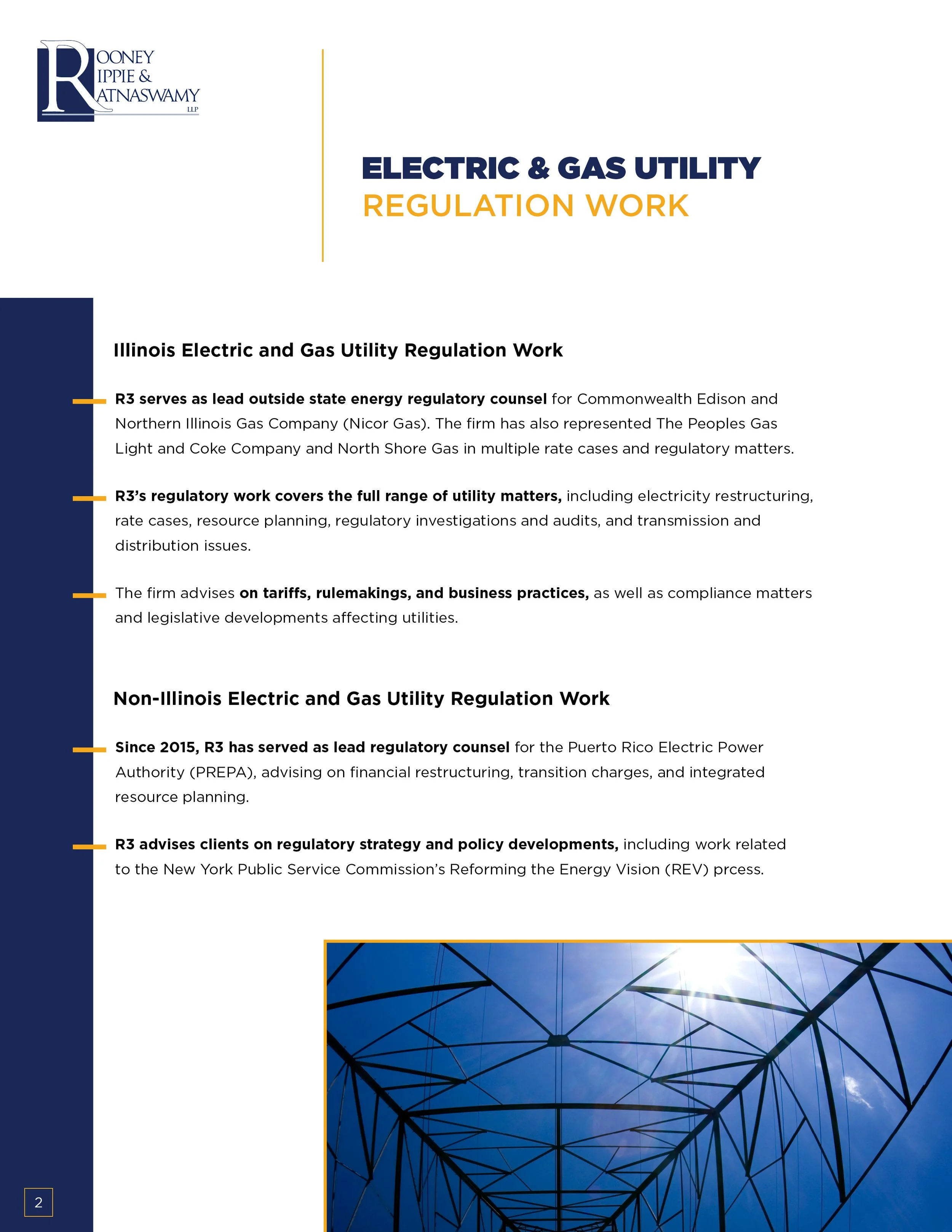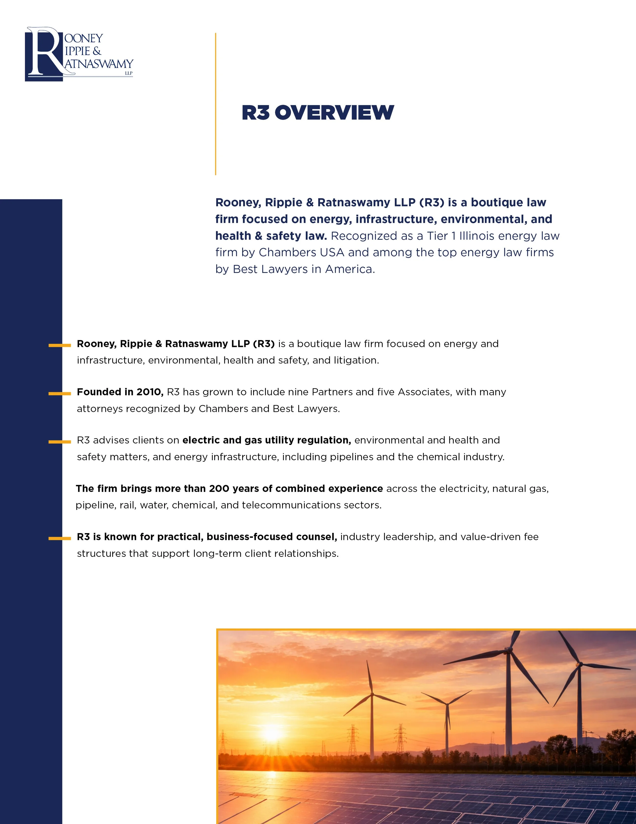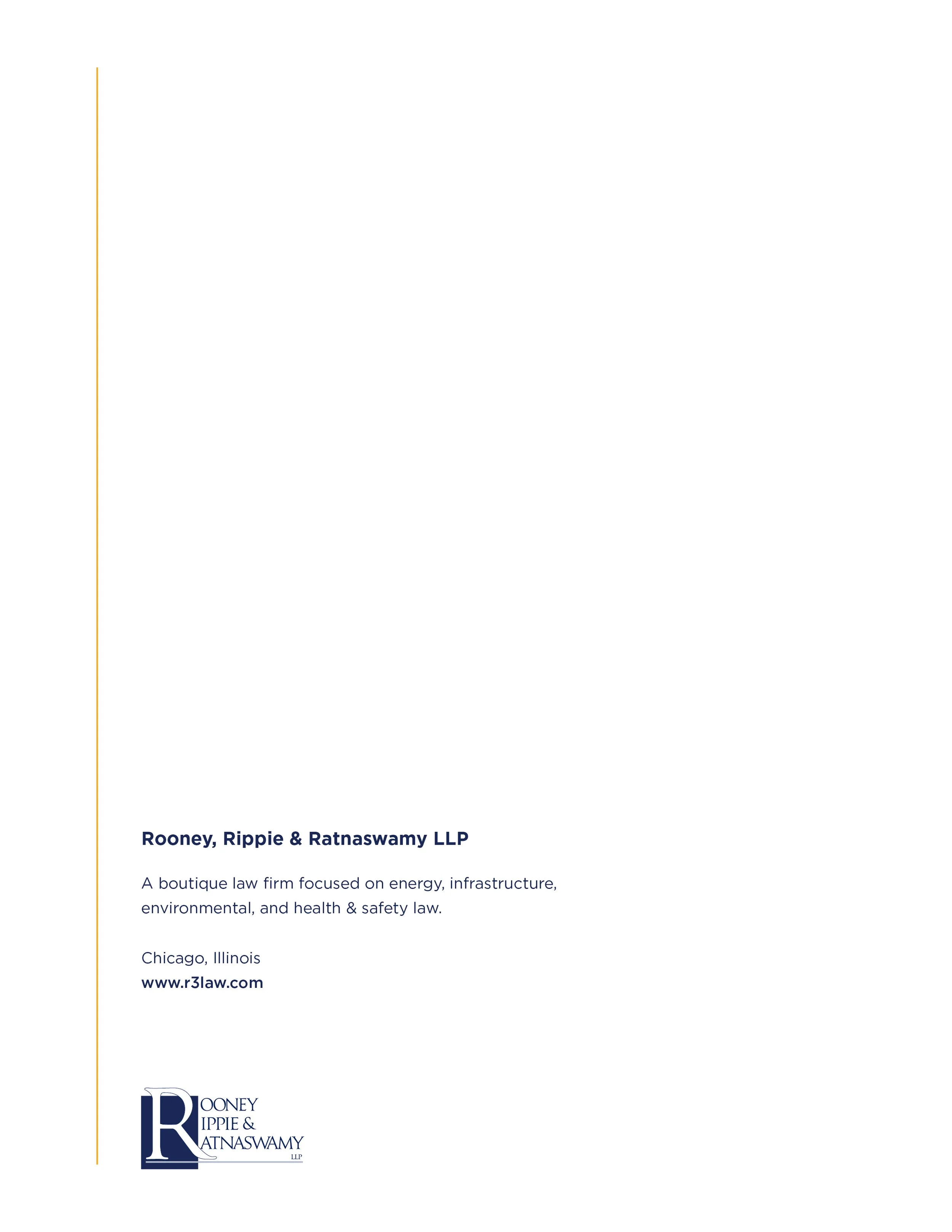 Rooney, Rippie & Ratnaswamy (RRR) is a boutique law firm specializing in energy, infrastructure, environmental, and regulatory law, working with major clients across the utility and energy sectors.