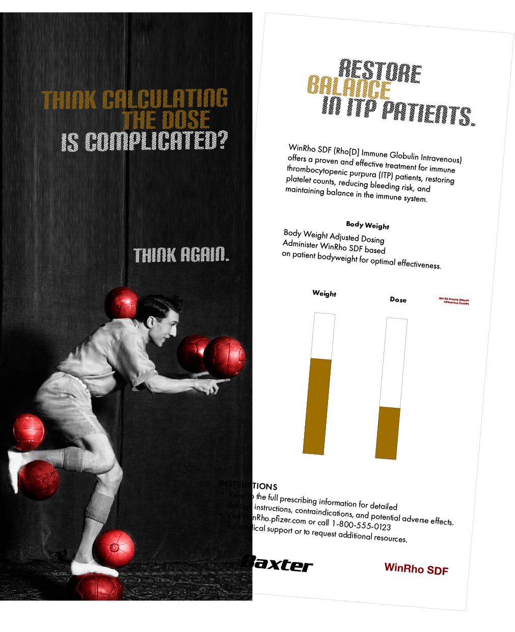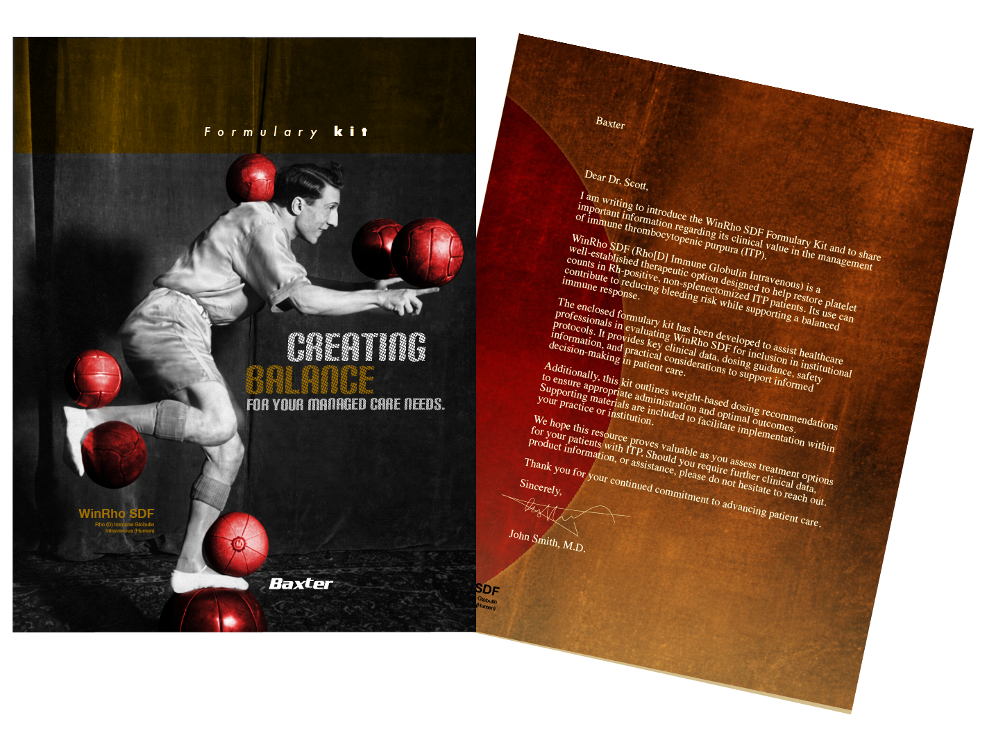 For this campaign, I developed a series of print and marketing materials, including journal ads, a formulary kit, and promotional visuals. The concept uses a striking visual metaphor—balancing red spheres—to represent platelet balance, creating a memorable and cohesive system across all pieces.